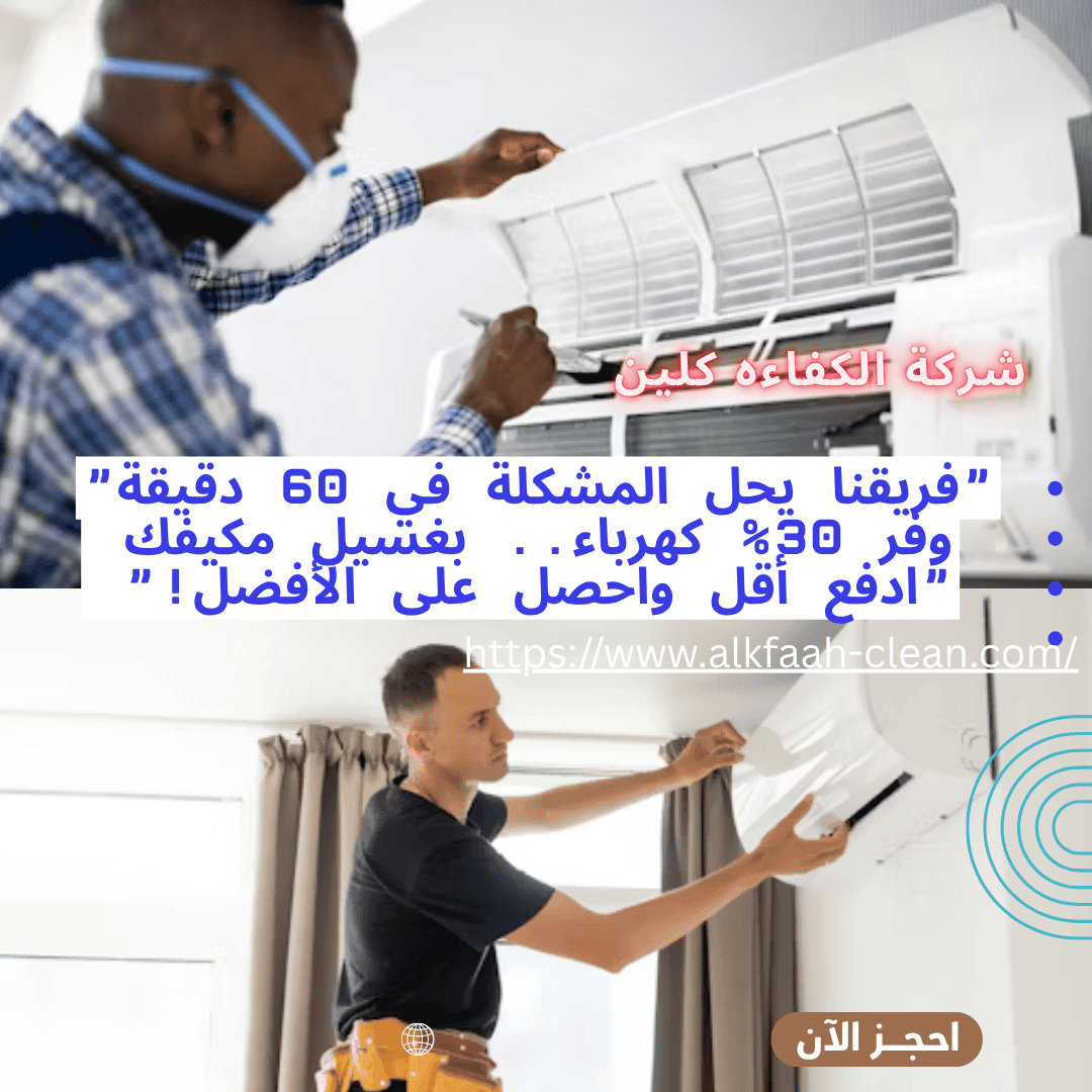 الجميع الان يعرف مدى الاهمية الكبيرة لتنظيف المكيفات وانها من الامور المهمة والملحة عليك كل فتره تنظيفها ، ولاجل ذالك شركة الكفاءه كلين وفرت لسكان مدينة الرياض خدمة تنظيف وتصليح المكيفات باعلى مستوى من التميز والدقة فى التنظيف والتصليح وذالك لااننا نتبع فى الشركة كافة المعايير الحديثة المستخدمة فى المجال والتى مشهورة فى العالم مما يساعدنا ذالك على تقديم الخدمة مميزة وءامنة ، كما أن شركة الكفاءه كلين شديدة الحرص على توفير للعاملين لديها كافة الالات والمعدات العالمية التى تم استيرادها من الخارج والتى تسعد العاملين على تقديم الخدمة بكفاءه اسرع ووقت اسرع فالخدمات التى تقدما الشركة ليست كباقى الخدمات التى تقدمهال الشركات الاخرى ولا حتى طريقة العمل ولا يوجد شركة تمتلك نفس خبرتنا ، اتصل بنا الان ولا تفوت العروض والخصومات التى تقدمها الشركة .